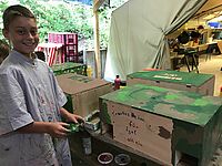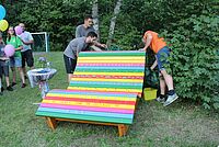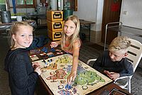 An drei verschiedenen Orten auf dem Freizeitgelände sitzen Kinder am Spielbrett. Eines davon haben sie sogar selbst aus Holz gesägt und bemalt.…